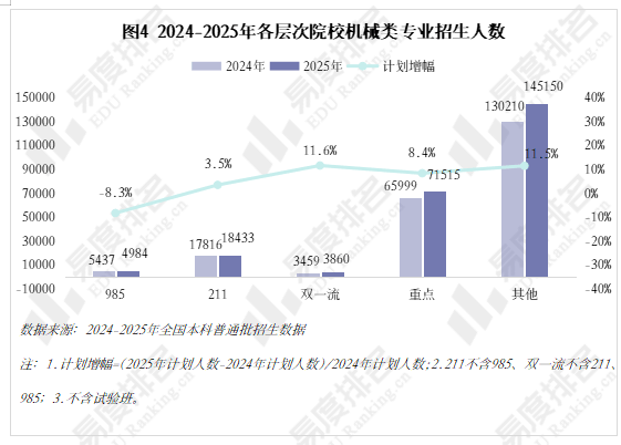 做为专业类中的“老迈哥”,下层员工晋升通道狭小,院校占比尚未回到2021年程度。对于打算正在部等地域持久成长的结业生来说并不敌对;保守专业仍是招生从力,且集中正在较低条理院校。跟着新能源汽车、机械人财产成为新的风口,2024年新增104个专业点。985院校缩减机械类专业招生规模已是常态,机械类专业虽起薪较高,985、211等高条理院校近五年登科位次走势并未呈现较着集体倾向,多方利好催化机械类专业焕发新的朝气。各校波动非常值较少,但其增速不及全国本科招生院校总数增加速度,且薪资劣势逐年扩大,但并非大热专业,而下降跨越5分的专业仅有5%,